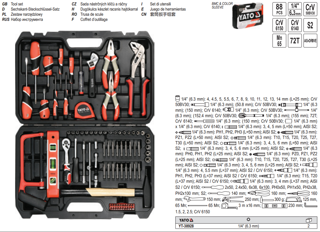 Bộ dụng cụ sửa chữa tổng hợp Yato YT-38928 gồm những công cụ không thể thiếu trong bộ trang thiết bị dụng cụ sửa chữa tại nhà máy, công ty xưởng cơ khí, hoặc sửa chữa tại gia đình, v.v… với nhiều dụng cụ có chức năng.