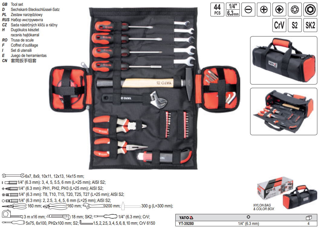 Bộ dụng cụ sửa chữa tổng hợp Yato YT-39280 là sản phẩm mang thương hiệu Yato Ba Lan, được sản xuất theo tiêu chuẩn Châu Âu, đạt chất lượng ISO 9001:2008.