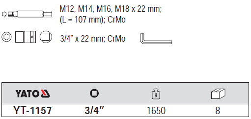 Bộ khẩu 3/4 inch kèm tuýp mũi sao 12 cạnh YT-1157 là sản phẩm mang thương hiệu Yato Ba Lan, được sản xuất theo tiêu chuẩn Châu Âu, đạt chất lượng ISO 9001:2008.