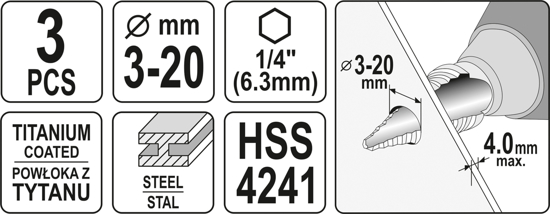 Bộ mũi khoan bước YATO YT-44731. Được thiết kế để khoan bằng thép không gỉ cao cấp, xây dựng và thép cán nguội, kim loại màu, thép tấm, nhựa. • được làm bằng thép tốc độ cao HSS 4241, được phủ titan nitride để tăng tuổi thọ của máy khoan • Các cạnh của lỗ khoan vẫn sạch sẽ và không có burr • định tâm tự động trên bề mặt tròn và trơn trượt • tản nhiệt nhanh khi khoan trong vật liệu cứng • 2 rãnh chip xoắn với 3 bề mặt phẳng cho khả năng truyền mô-men xoắn cực đại