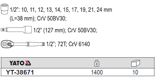 Bộ tay vặn 1/2" YT-38671 là sản phẩm mang thương hiệu Yato Ba Lan, được sản xuất theo tiêu chuẩn Châu Âu, đạt chất lượng ISO 9001:2008.