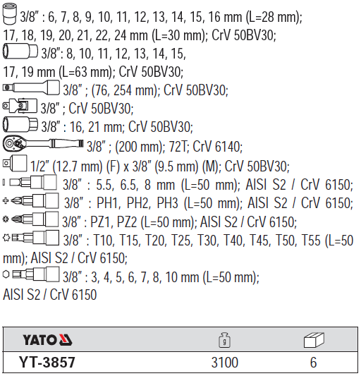 Bộ tay vặn 3/8" YT-3857 là sản phẩm mang thương hiệu Yato Ba Lan, được sản xuất theo tiêu chuẩn Châu Âu, đạt chất lượng ISO 9001:2008.