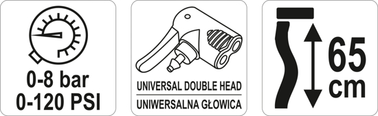 Bơm vận hành bằng tay với áp suất tối đa 0,8 bar . Nó có một đầu phổ quát để bơm van xe hơi và xe đạp.