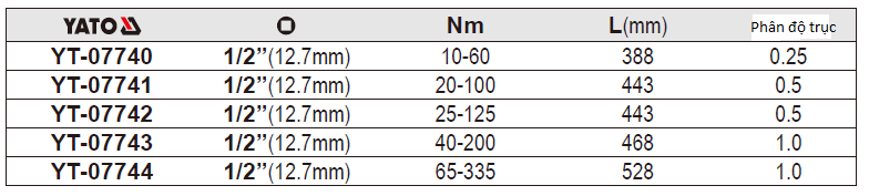 Thông số kỹ thuật Cờ lê lực 1/2 inch 20-100Nm 443mm YT-07741