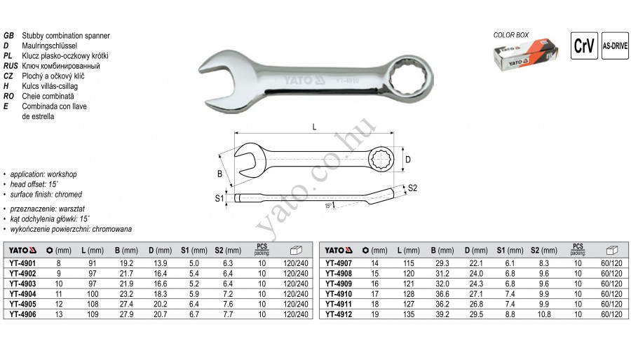 Cờ lê vòng miệng loại ngắn( dạng bóng) YT-4901 là sản phẩm mang thương hiệu Yato, được sản xuất theo tiêu chuẩn Ba Lan .