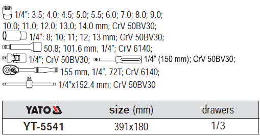 Khay bộ tuýp tay vặn tông hợp 1/4" YT-5541 là sản phẩm do hãng Yato Ba Lan sản xuất theo tiêu chuẩn Châu Âu. Sản phẩm không thể thiếu dành cho việc sửa chữa, bảo dưỡng ô tô, xe máy, máy móc, các thiết bị công nghiệp.