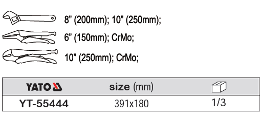 Khay kìm chết, mỏ lết hệ inch YT-55444 là sản phẩm do hãng Yato Ba Lan sản xuất theo tiêu chuẩn Châu Âu. Sản phẩm không thể thiếu dành cho việc sửa chữa, bảo dưỡng ô tô, xe máy, máy móc, các thiết bị công nghiệp.