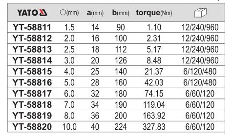 Lục giác hệ mét dài cạnh ở giữa của hãng Yato được đánh giá cao vì có chất lượng tốt, độ cứng cao không bị tòe đầu lục giác khi sử dụng, sẽ giúp bạn yên tâm khi dùng trong thời gian dài. Loại lục giác hệ mét này có rất nhiều kiểu kích thước khác nhau từ 1.5mm cho đến 10.0mm sẽ đủ cho bạn chọn phù hợp với yêu cầu công việc của từng khách hàng.