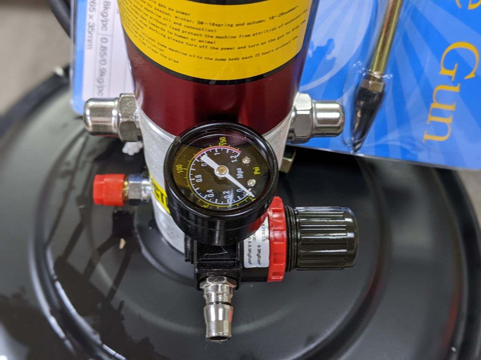 Nạp khí nén: Khí nén từ máy nén khí được đưa vào van điều áp của máy bơm mỡ. Van điều áp sẽ điều chỉnh áp suất khí nén phù hợp với nhu cầu sử dụng.