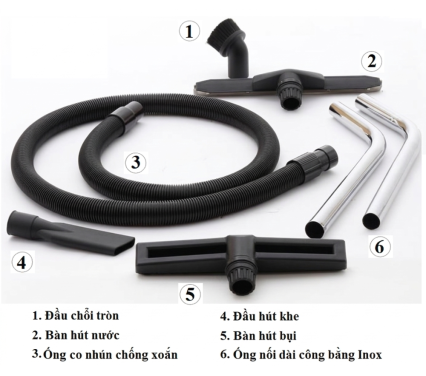 Phụ kiện: Bàn hút bụi, bàn hút nước, ống mềm, đầu hút góc, đầu chổi tròn
