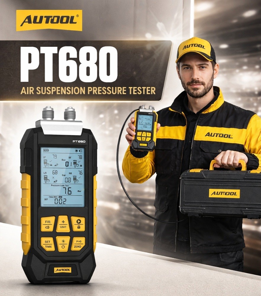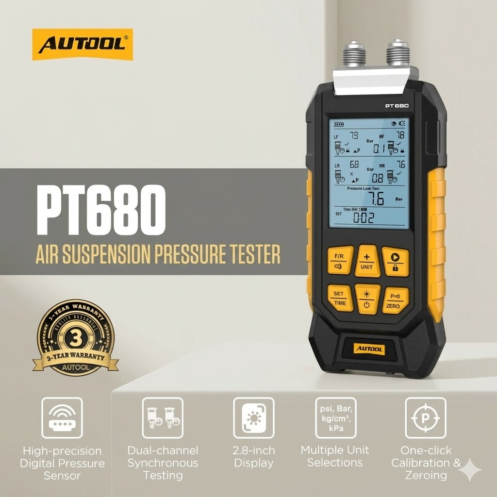 AUTOOL PT680 là máy đo áp suất chuyên dụng cho hệ thống treo khí nén ô tô, cho phép kiểm tra đồng thời hai bên hệ thống và phân tích chênh lệch áp suất theo thời gian thực.