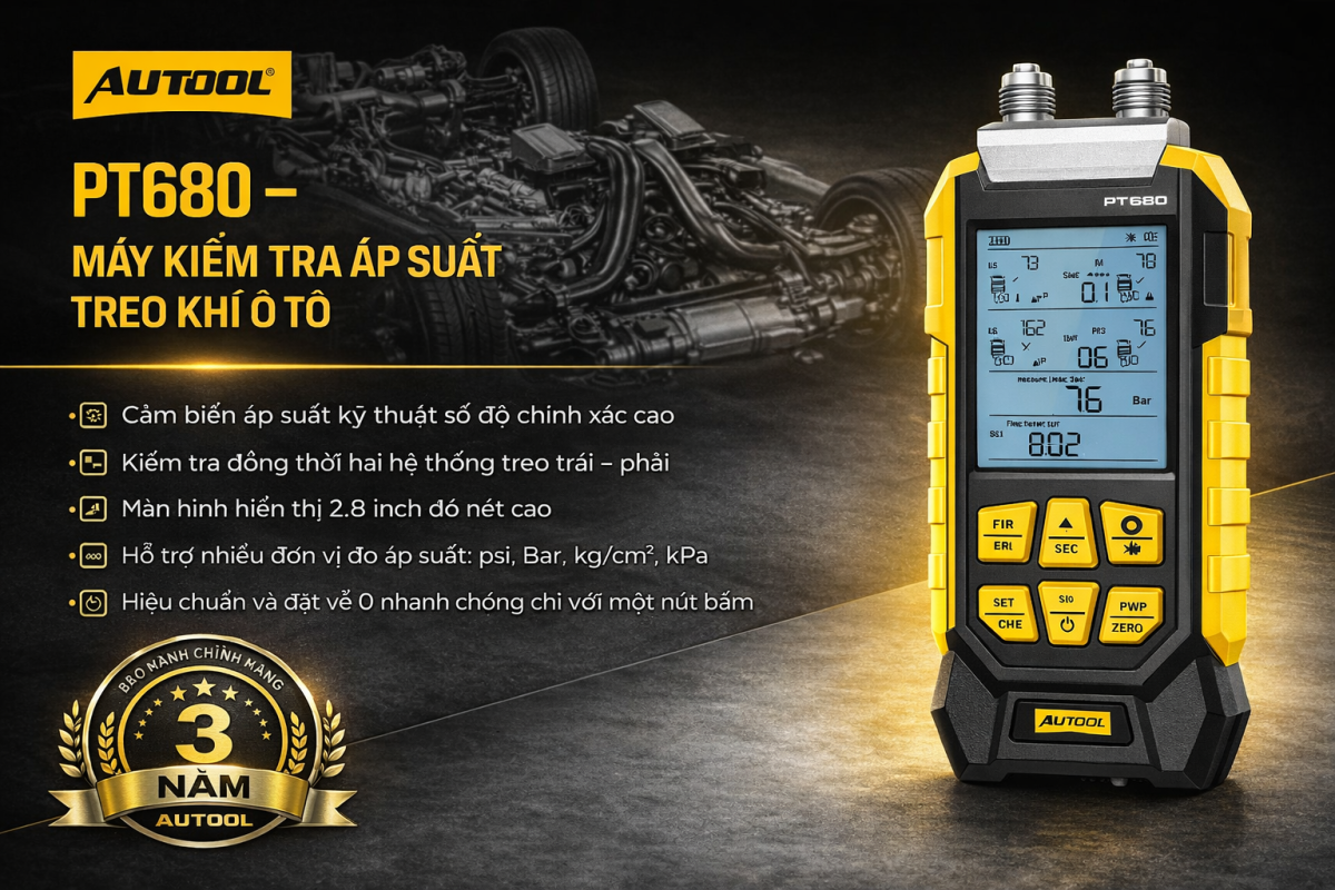 AUTOOL PT680 dùng để kiểm tra hệ thống gì? Thiết bị được thiết kế để kiểm tra áp suất và phát hiện rò rỉ trong hệ thống treo khí của ô tô.