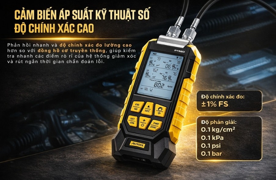 Độ chính xác của thiết bị là bao nhiêu? AUTOOL PT680 có độ chính xác cao ±1% FS, giúp phát hiện những biến động áp suất rất nhỏ trong hệ thống.