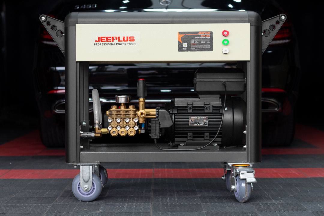 Với dòng sản phẩm máy rửa xe cao áp thì Jeeplus có model JPS-RP450 sử dụng điện áp 3 pha 380V công suất motor 4.5kW. Động cơ 4.5kW giúp máy có thể quay 1400 vòng/phút tạo ra áp lực nước trong khoảng 120-150 bar, lưu lượng nước tiêu thụ 1560 lít/giờ tương đương với 26 lít/phút.