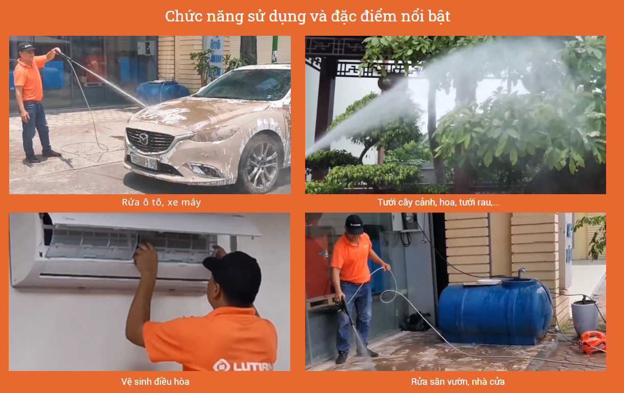 Với đặc điểm tiết kiệm nguồn nước sử dụng và áp lực cao, Máy rửa xe gia đình tự ngắt Lutian LT210G-1600 không chỉ hữu dụng trong việc rửa xe mà còn có thể giúp ta vệ sinh máy móc, điều hòa, tàu xe, công trình xây dựng, nhà bếp, nhà vệ sinh, dây chuyền sản xuất, vệ sinh điều hòa.