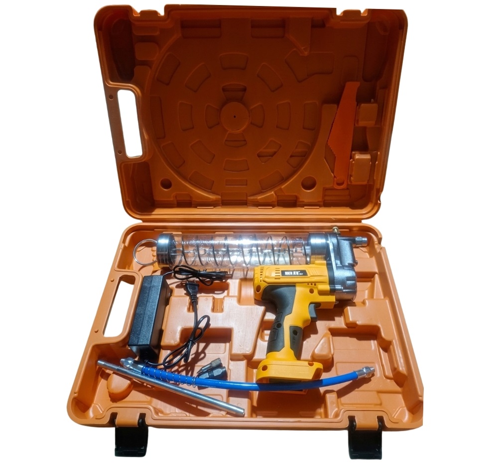 Máy hoạt động dựa trên động cơ điện dùng pin kết hợp cơ cấu piston áp lực cao. Khi bóp cò, motor sẽ đẩy piston tạo áp lực lớn, ép mỡ từ ống chứa đi qua ống dẫn và đầu bơm, giúp mỡ được phân phối đều và chính xác đến vị trí cần bôi trơn.