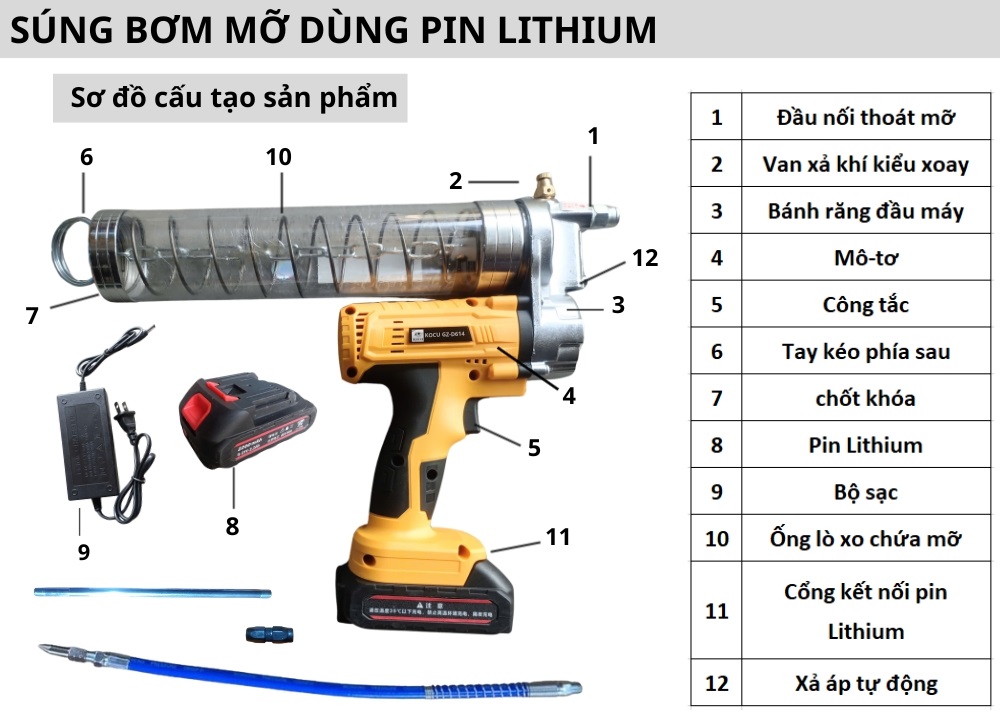 Cách dùng của Súng Bơm Mỡ Cầm Tay Dùng Pin 21V KOCU D-614: