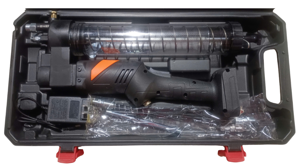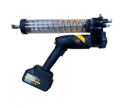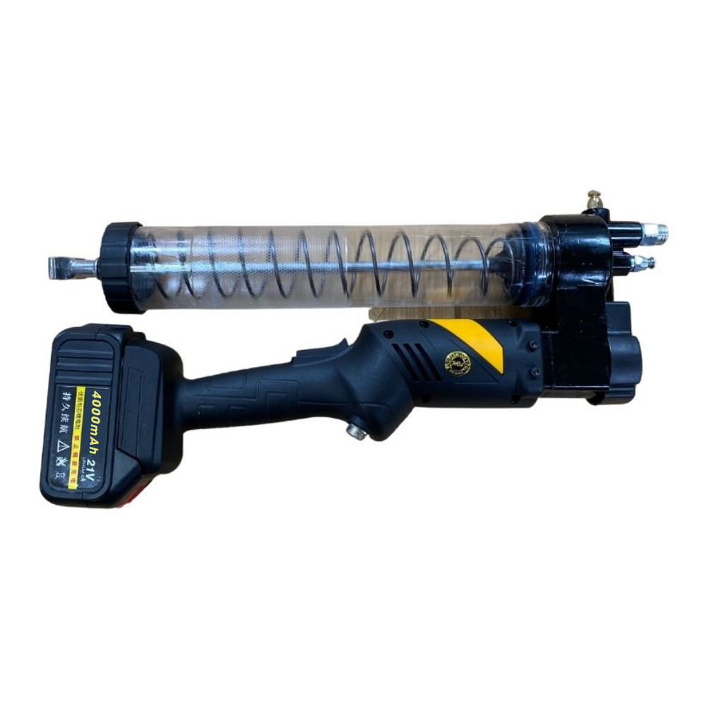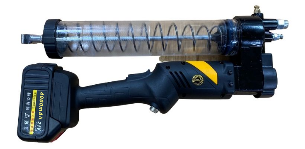 • Thiết bị hoạt động dựa trên động cơ điện sử dụng pin Lithium 21V, tạo ra lực đẩy mạnh để nén mỡ trong thùng chứa. Khi người dùng bóp cò súng, piston sẽ tạo áp suất cao đẩy mỡ qua ống dẫn đến đầu bơm và đưa trực tiếp vào các điểm cần bôi trơn của máy móc, đảm bảo mỡ được phân phối đều và nhanh chóng.