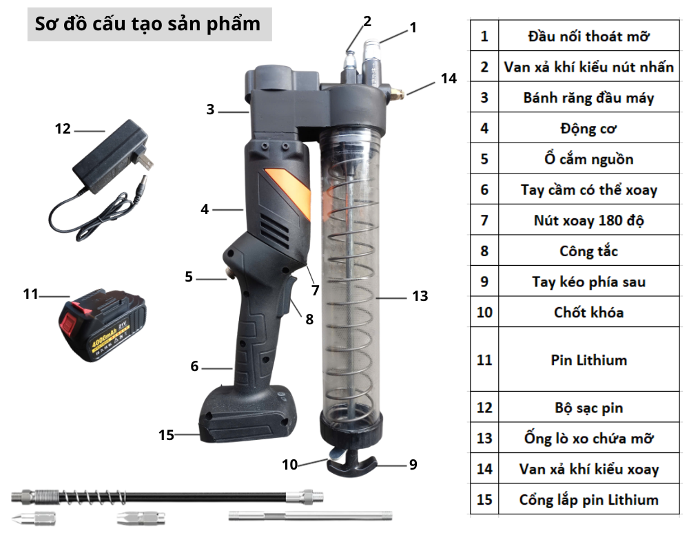 • Trang bị ống bơm cứng và ống bơm mềm phù hợp với nhiều vị trí bôi trơn khác nhau
