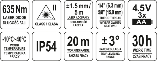 Laser chuyên nghiệp để xác định chính xác các đường dọc và ngang. Hữu ích trong việc hoàn thiện và xây dựng công trình, ví dụ: khi lắp đặt trần treo, xác định vị trí của hộp điện, vách ngăn.
