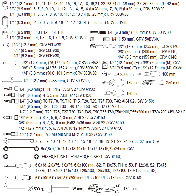Có đầy đủ các chi tiết hệ inch và hệ mét 1/2", 1/4", 3/8”.