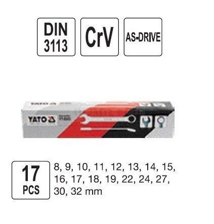 Bộ gồm 17 chi tiết cờ lê có kích cỡ lần lượt là 8; 9; 10; 11; 12; 13; 14; 15; 16; 17; 18; 19; 22; 24; 27; 30; 32mm có màu trắng bạc, được làm từ thép hợp kim CrV, đồ bền cao, không hoen gỉ trong quá trình sử dụng. Ngoài ra còn được tráng sơn tĩnh điện bóng làm tăng độ bền cho sản phẩm.