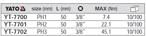 Ngoài model YT-7700, đầu tuýp 3/8" mũi vít 4 cạnh Yato còn một số model khác trong bảng dưới đây: