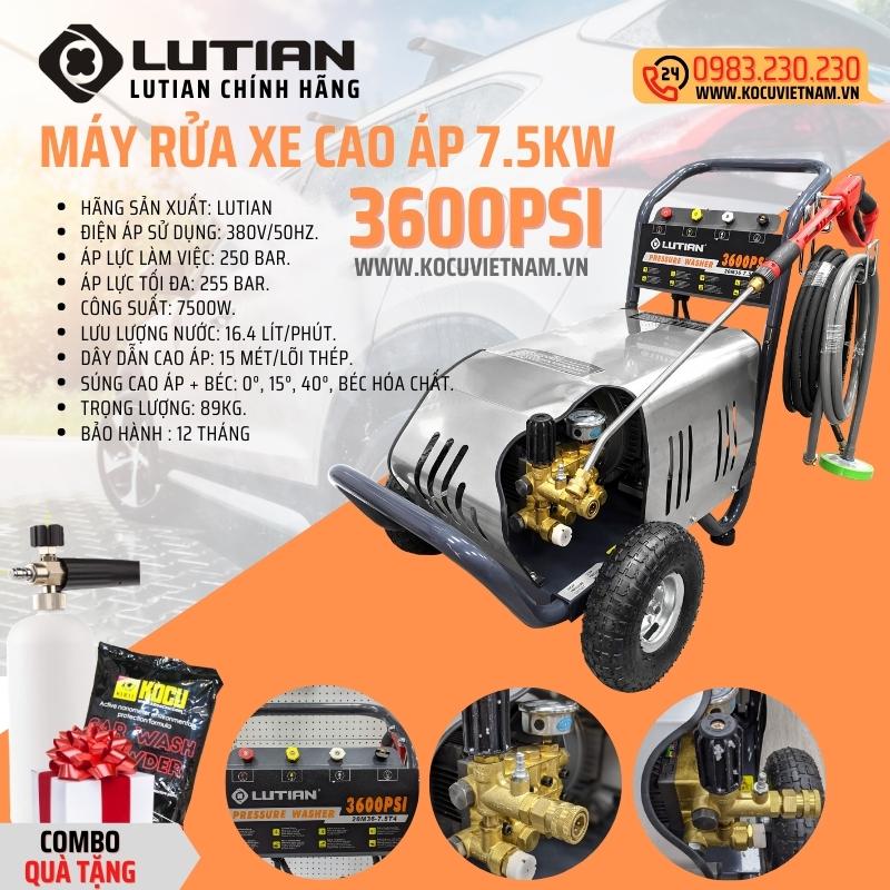 thân máy, 01 dây cao áp 15m, 01 súng cao áp, 4 béc (0º, 15º, 40º, đầu phun hóa chất)